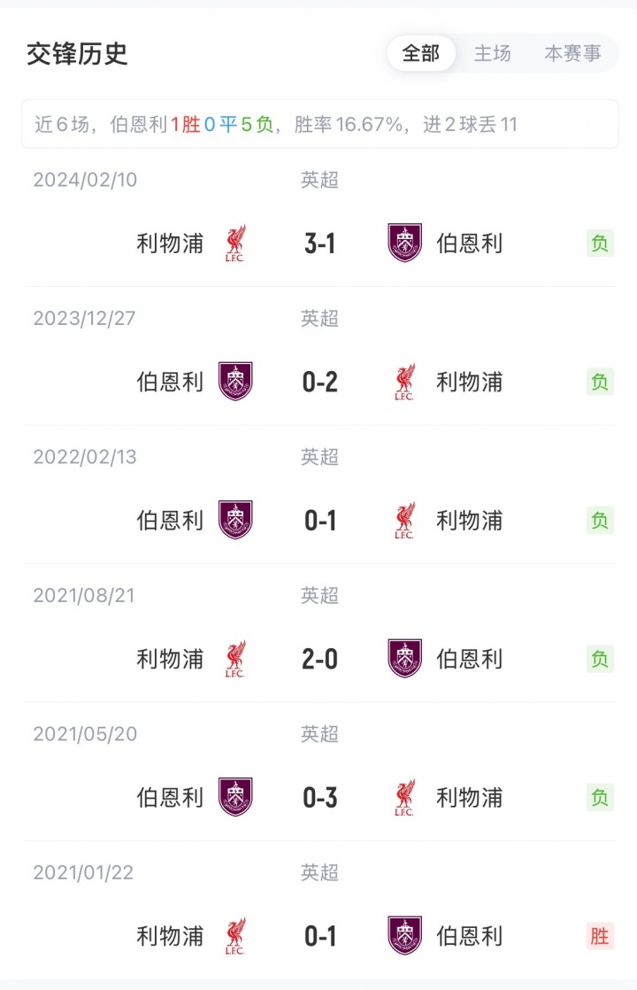 利物浦在客战对阵伯恩利的近9场英超比赛中赢了8场,最近6场取得连胜。