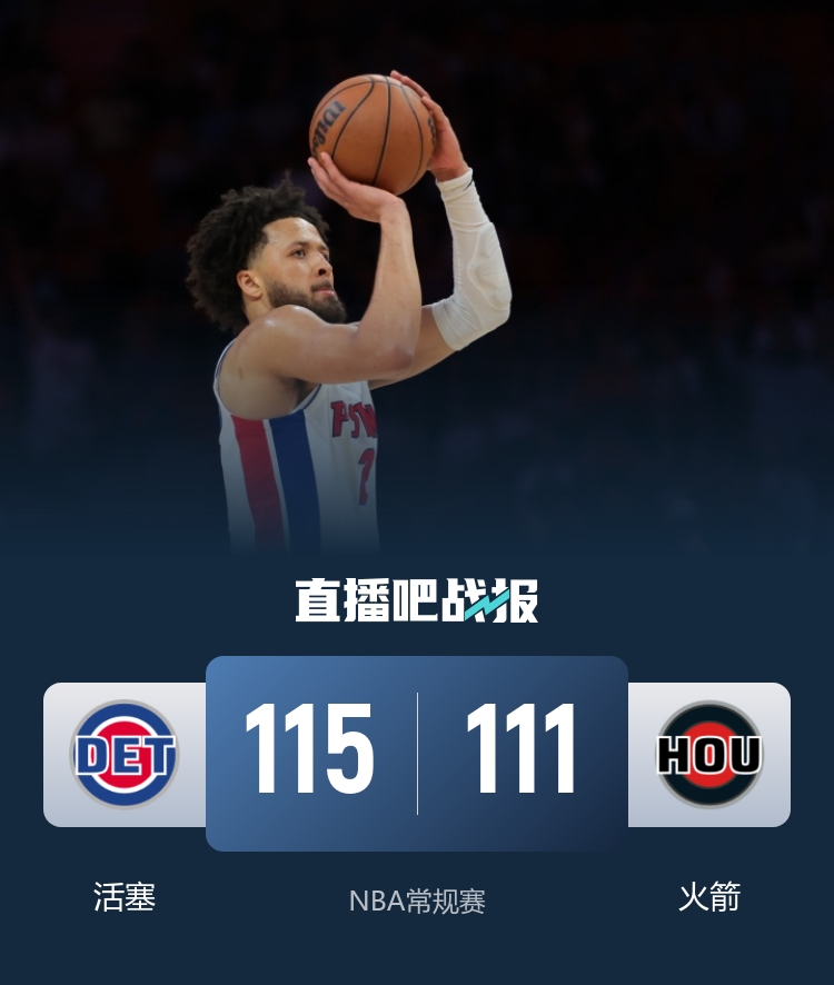 此役一上来杜兰特联手阿门先声夺人,但中段火箭进攻停滞,活塞多点开花后来居上,申京和杜兰特造杀伤稳住局势,首节结束时火箭领先1分,次节回来,杜伦肘击阿门被吹二级恶犯累积技犯被驱逐,奥萨尔和邓罗内外结合,半场战罢,活塞反超7分。短暂休整后杜兰特里突外投一度反超,末段两队你来我往陷入僵持,三节结束后活塞保有1分优势,末节决战,杜兰特挥舞镰刀连续单打,但活塞总能给予回应,申京绝平上篮被里德大帽,康宁汉姆两罚全中后火箭无力回天,最终火箭111-115不敌对手遭连败。